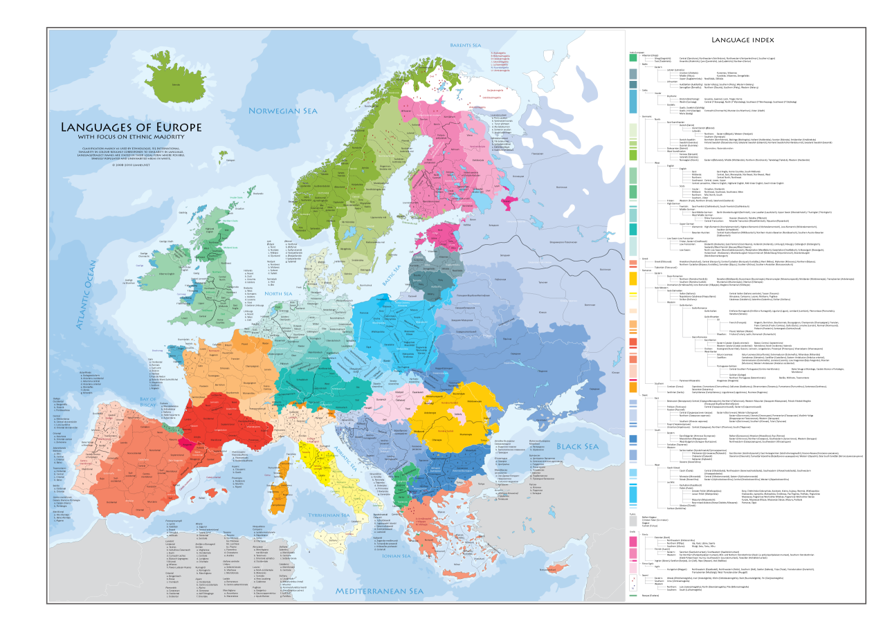 In my twenties I lived in Nijmegen and had very little to do. I had discovered computers in my late teens and was very comfortable using them. I knew how to use Illustrator and Inkscape, had a drawing tablet and only a very small social circle (I had fled my home town which had started to suffocate me, but now I was kinda on my own). I took up the hobby of drawing language maps again, but now with the aid of PC for drawing and the internet for information gathering. That was awesome! Suddenly I found a plethora of information online: language maps drawn by others and scientific articles about language and dialect distribution. I now had enough material and time to craft my first serious language map: the languages and dialects of Europe: